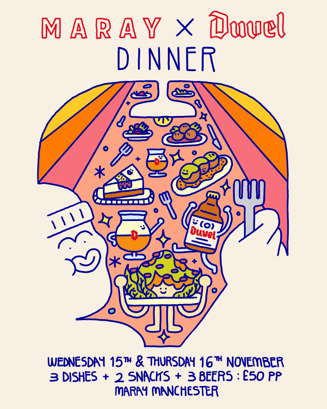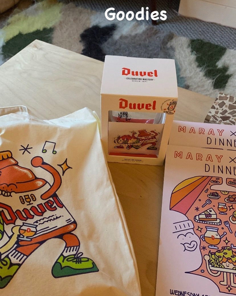 I was invited by Duvel to create artwork for the promotion of their tasting menu experience with MARAY, as well as artwork for the menu, and gift bags for the guests who attend.
